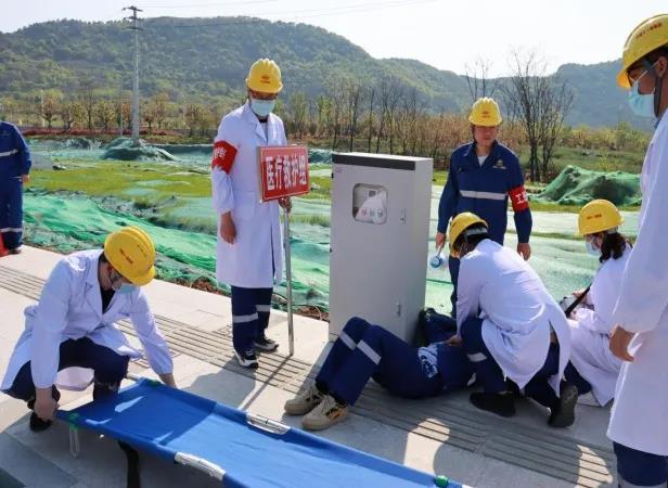 本次演练主要分为事故演练和应急处置措施培训两部分。首先开始的事故演练以一名电工检修配电箱时突发触电事故为背景。项目部接到事故汇报后,立即按既定预案启动事故应急处置程序,各应急小组迅速到位、协调配合,分别承担现场警戒、人员应急医护救援、后勤物资保障等任务,顺利完成了本次演练。在应急处置措施培训环节,项目部邀请了溧水区永阳镇社区医院医生现场讲解、培训了心肺复苏、人工呼吸等施工常见事故的紧急处理措施。全部演练结束后,南京市溧水区城乡建设局质量安全监督站负责人对演练成果及项目部有序有效的组织能力表示了肯定。