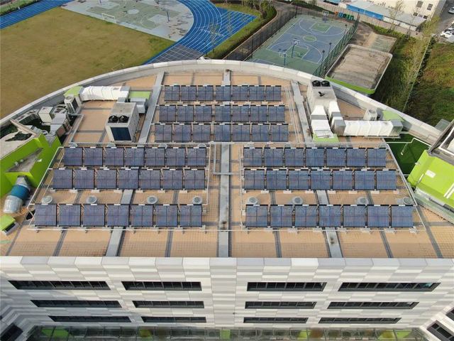——室外运动场雨棚屋面由太阳能光伏发电板组成,既能够发电也能够遮风挡雨。部分屋面也建有真空管太阳能热水系统,太阳能热水可供厨房使用。