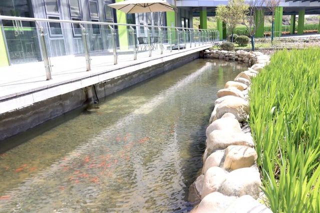 ——教学楼周边利用雨水回收系统,建有下凹式绿地和景观鱼池,既实现了循环利用雨水的环保功能,更是孩子们课间休息玩耍、做科学实践活动的好去处。