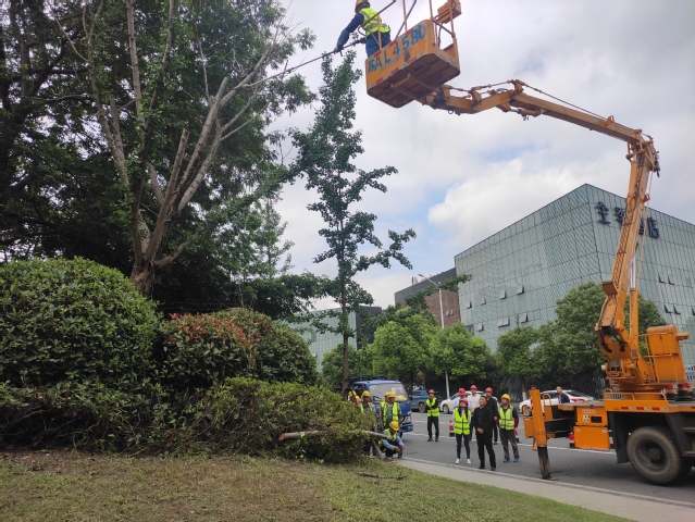 与此同时,另一条指令随即传出,“河西大街树木枯枝断枝,存在极大安全隐患,立刻到场处置”。公司立即调配3辆园林抢险车辆、1辆高架车,20名抢险队员第一时间赶到现场。指挥勘查险情、实施围挡、引导交通、处理险枝,大家分工明确、操作熟练,抢险过程一气呵成。20分钟后,这株干径超过40厘米、高10米的大树上的枯枝已全部修剪到位,解除了安全隐患。