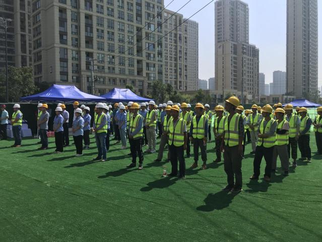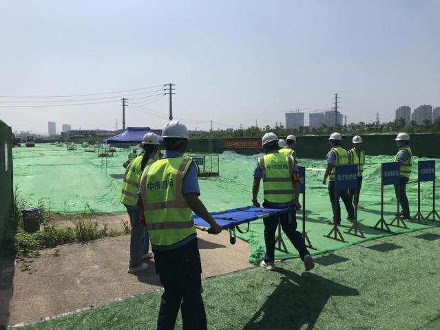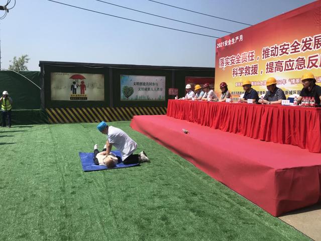 本次应急救援演练由河西集团新城公司承办。模拟事故发生后,班组负责人向项目安全部汇报。项目经理立即联系附近双闸街道卫生院请求医护救援,组织应急救援工作,向监理及甲方主要领导报告事故发生情况。随后,有关人员及队伍按照现场救援指挥部的指示及《高温中暑应急救援预案》的要求开展救援及善后工作。