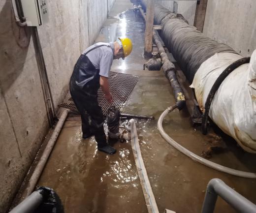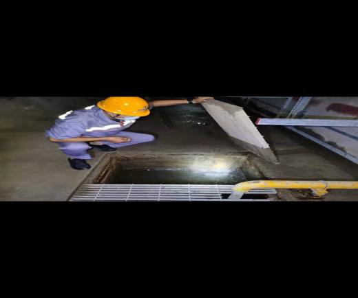 管廊处于地下五米,内部干燥闷热。此次检修因在一平方米左右的受限空间内操作,且蓄水池内积水较多,无法下池检修水泵具体的故障原因,工程人员立即采取措施接通备用水泵连接水带,先将积水排出,并清理蓄水池里的垃圾。狭窄的蓄水池内弥漫着异味,池内能见度几乎为零。几经探查,成功排查出止回阀已损坏。工作人员查明故障原因后,第一时间制定检修方案,顺利完成了抢修,此时汗水已经完全湿透了他们的工作服。
