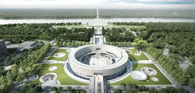 项目建设范围总面积约为62000 平方米。建设内容包含宪法展厅及宣誓广场、法之谷城市绿坡及配套设施、场地东西两侧的人行天桥、场地东侧的公园主入口广场等(场地北侧的湿地公园维持现状,不做开发)。容积率 0.09,建筑密度 9%,绿地率 36.8%。本项目总建筑面积为 29896 平方米,其中地上建筑面积 5584 平方米,地下建筑面积24312 平方米,建筑高度 16.5米,地上 2 层(首层架空),地下 1 层。功能包含展览及地下车库等。