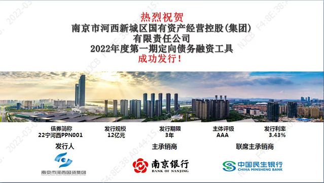3月9日,南京市河西新城区国有资产经营控股(集团)有限责任公司(以下简称“河西集团”)成功发行2022年度第一期定向债务融资工具。