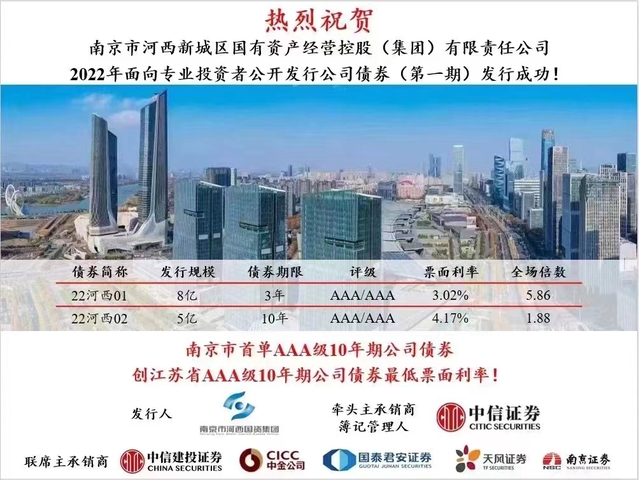 本次发行为批文下首期发行,由中信证券担任牵头主承销商及簿记管理人,在主承销商的共同努力下获得了圆满成功。本次发行获得了市场投资者的高度认可,体现了投资人对河西集团未来业务发展的强烈信心!本次发行的10年期品种,亦为南京市首单10年期公司债券。河西集团本次发行10年期公司债券,以较低的融资成本锁定了长期的资金需求,充分体现河西集团对市场时机的准确把握以及对直融市场融资工具成熟的使用能力,为债券市场作出了积极的示范效应。