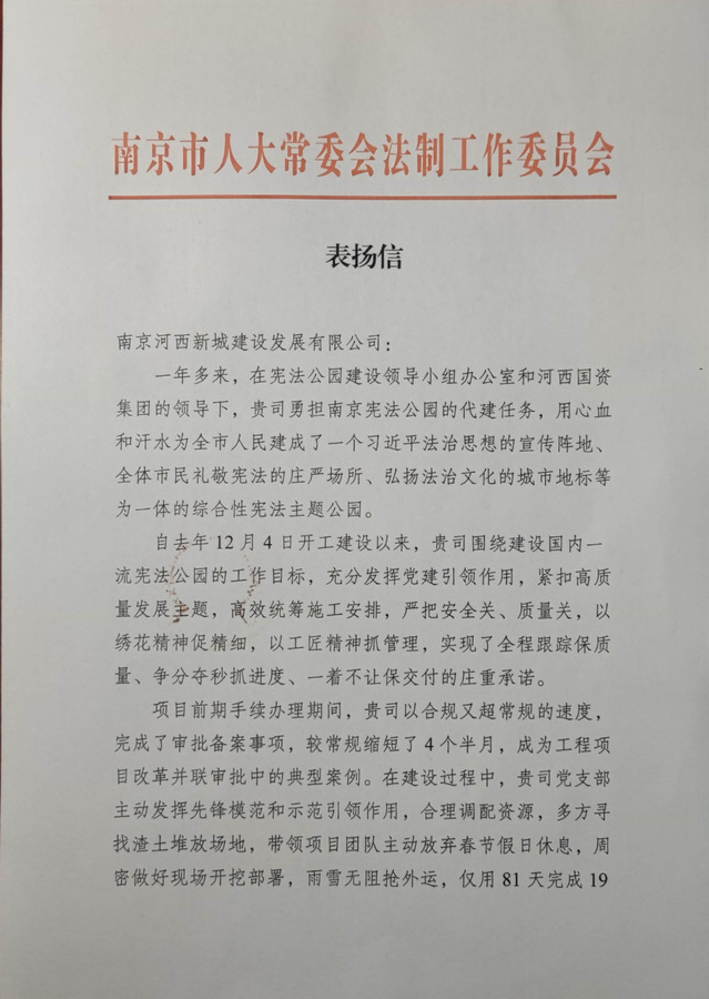 近日,河西集团新城公司收到南京市人大常委会法制工作委员会表扬信,信中对新城公司顺利履约宪法公园项目代建任务表示了肯定与感谢。