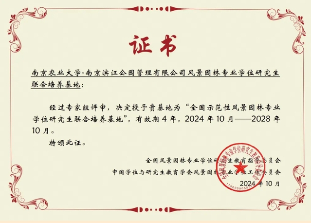 近日,全国风景园林专业学位研究生教育指导委员会正式公布了2024年“全国示范性风景园林专业学位研究生联合培养基地”名单。南京滨江公园管理有限公司与南京农业大学合作共建的“南京农业大学—南京滨江公园管理有限公司风景园林专业学位研究生联合培养基地”,凭借卓越的联合培养成效和深厚的校企合作基础,再次获此资质。