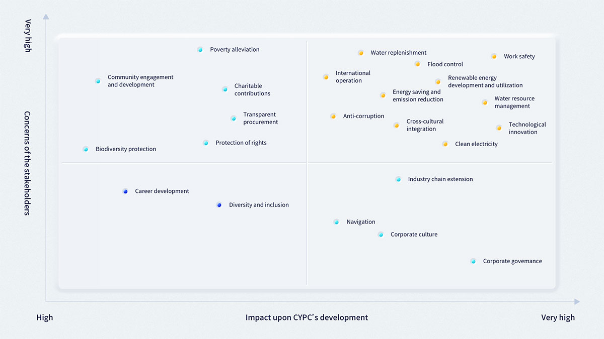 Based on two dimensions -“the impact upon CYPC’s development”and “concerns of stakeholders”, we have prioritized topics thathave a great influence and attract widespread attention, together with internal and external comments and recommendations.